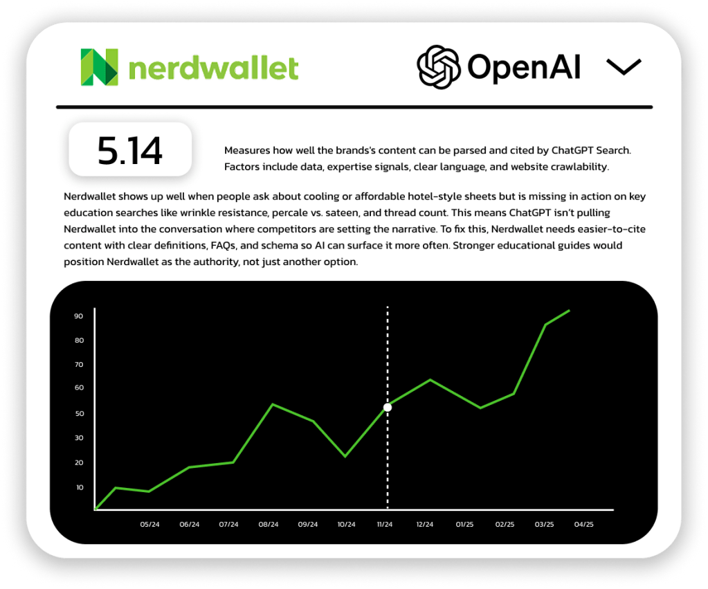 “Our score confirmed what we had suspected all along. We weren’t showing up in AI results, but now we could finally see why. With the roadmap in hand some fixes took a while, but others, like unblocking ChatGPT’s crawlers, made an instant impact. This is the only tool that’s ever made our AI presence measurable, and actionable.”